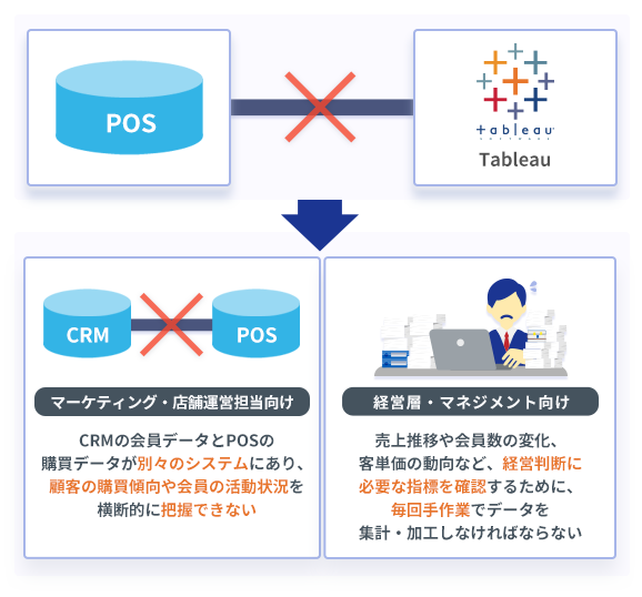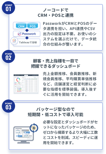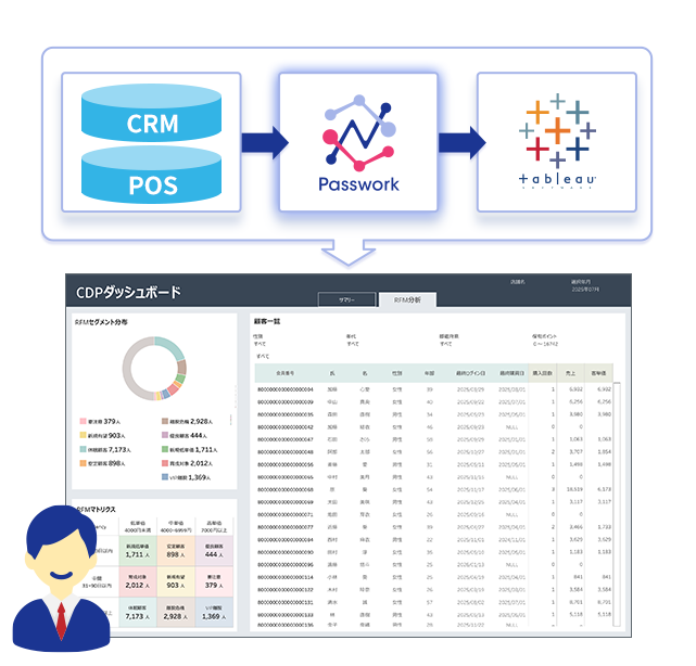 CRMとPOSシステムをそれぞれ導入したけれどもデータ分析までは当初考えていなかったと、CRMの会員データとPOSの購買データは分断されがちな傾向があります。 この導入パッケージでは、Passworkを活用してCRM・POSのデータをTableauに統合。会員の購買傾向から経営判断に必要なKPIまでを一元的に可視化します。