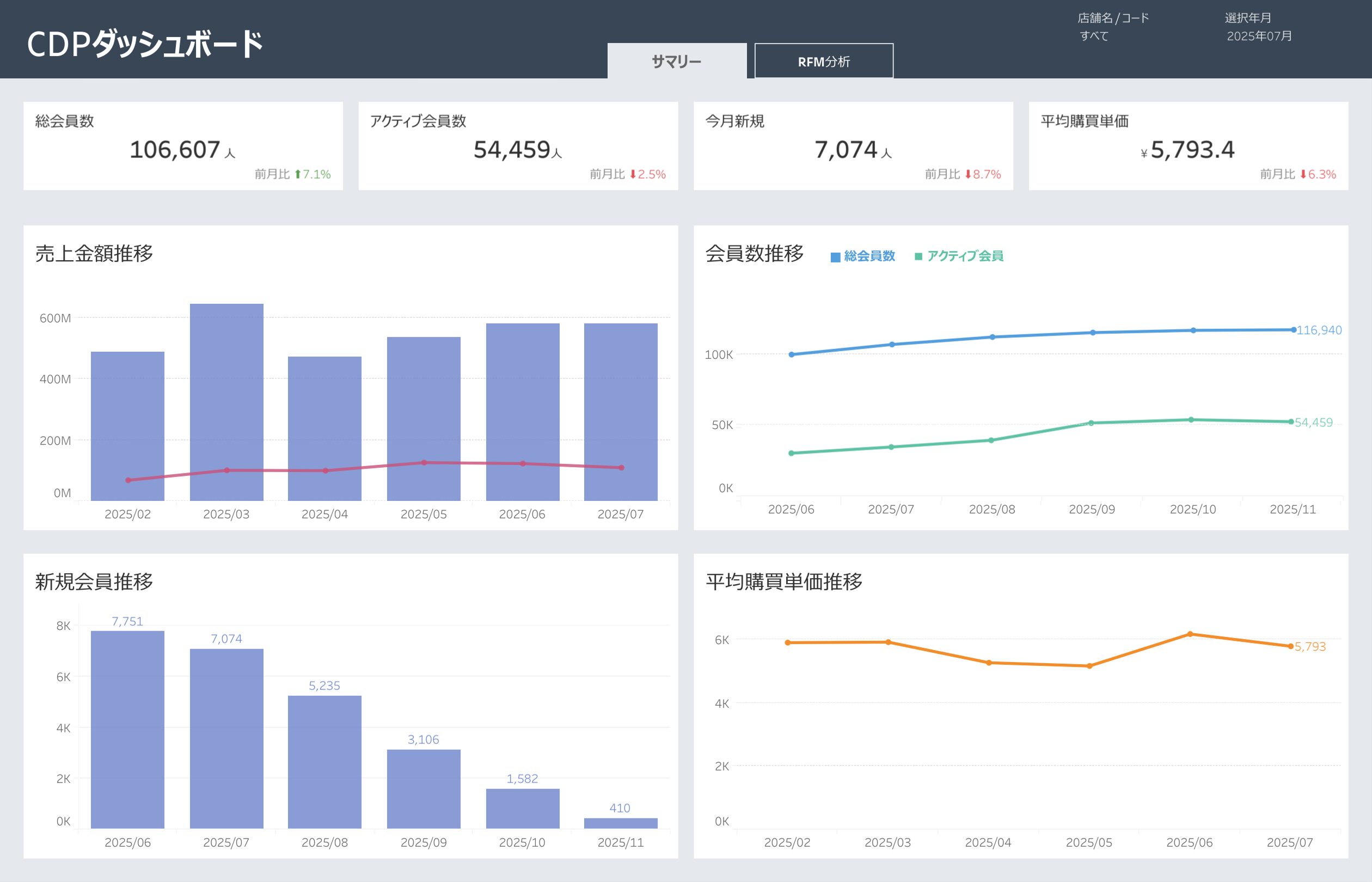 売上金額推移、会員数推移、新規会員推移、平均購買単価推移など、店舗運営と経営判断に必要な指標を標準装備。さらにRFM分析による顧客セグメンテーションにも対応し、導入後すぐに活用を開始できます。