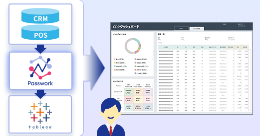 CRMとPOSシステムをそれぞれ導入したけれどもデータ分析までは当初考えていなかったと、CRMの会員データとPOSの購買データが分断されがちです。本パッケージでは、Passworkを活用してCRM・POSのデータをTableauに自動連携。売上推移や会員数、購買単価といった経営指標の把握から、RFM分析による顧客セグメンテーションまでを一元的に可視化できます。パッケージ型のため、最短1ヶ月で導入可能です。